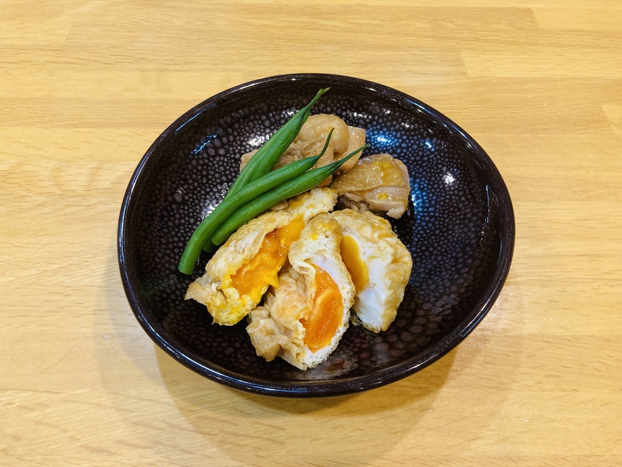 ⑤あぶたまの爪楊枝をとり、斜め半分に切り取って、鶏肉を一緒にうつわを盛り合わせ