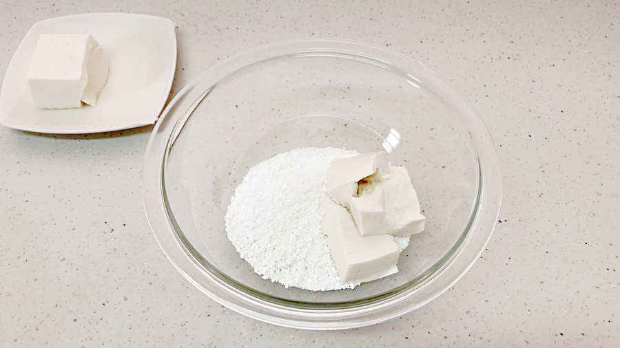 ボウルに白玉粉100gを入れ、絹ごし豆腐1/2丁の半分(1/4丁)を入れてこねます。そのあと、固さを見ながら残りの絹ごし豆腐を入れてこねます。