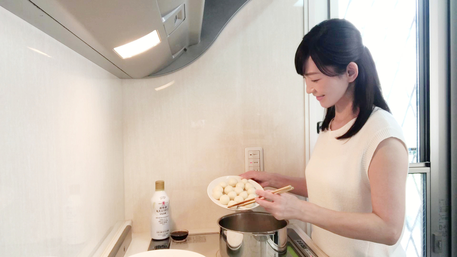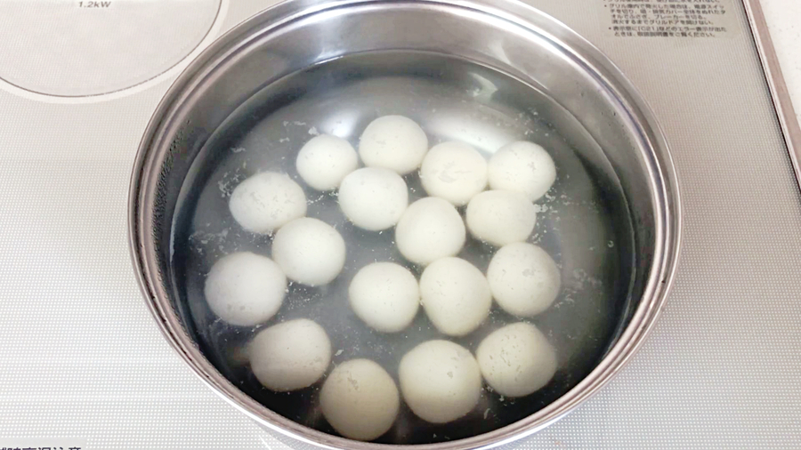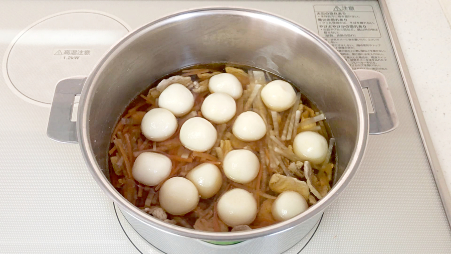 そこにこねた団子を全て入れてから、中火で3~4分茹でます。