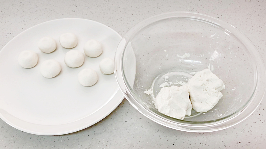 豆腐が足りなければ、水を入れて加減し、16個の団子に丸めます。