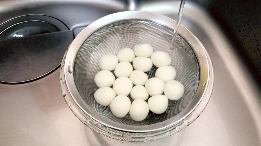 時間になったら、冷水にとって冷やし、ざるにあげて水気を切ります。