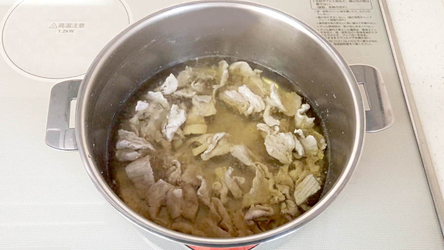 だし汁3カップを火にかけて、切った豚肉を入れてから、一度煮立てて灰汁を取ります。