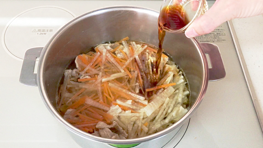 さらに大根、ニンジンを入れて火を通し、淡口醤油大さじ2で味をつけます。