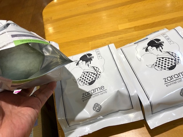 京都から届いてるのに、いま作ったばっかりみたいな綿菓子が入っています。しかも、ジップロックを開けるとパンパンに入っています」