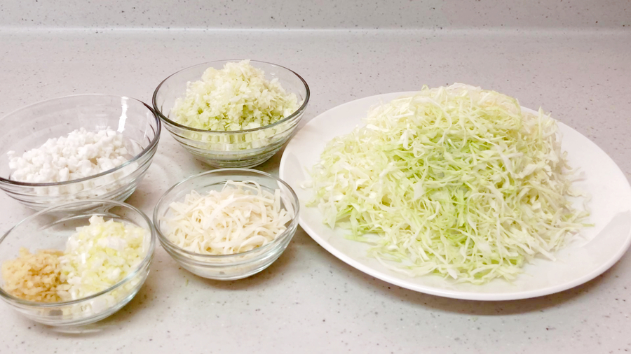 【A】キャベツ100gは粗みじんに切ります。【B】キャベツ200gは千切りにします。