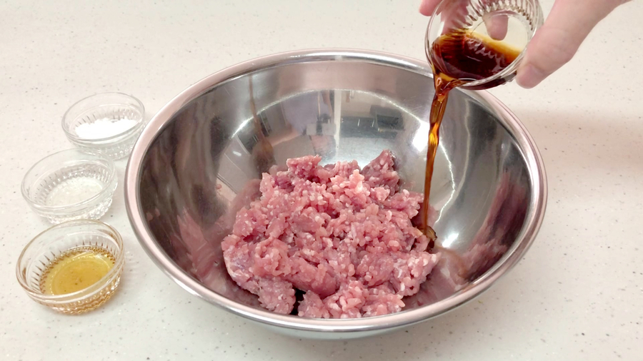 豚ひき肉200gと【C】(淡口醤油大さじ1、酒大さじ1、砂糖小さじ1、ごま油小さじ1)をボウルに入れて、粘りが出るまでよく混ぜ合わせます。