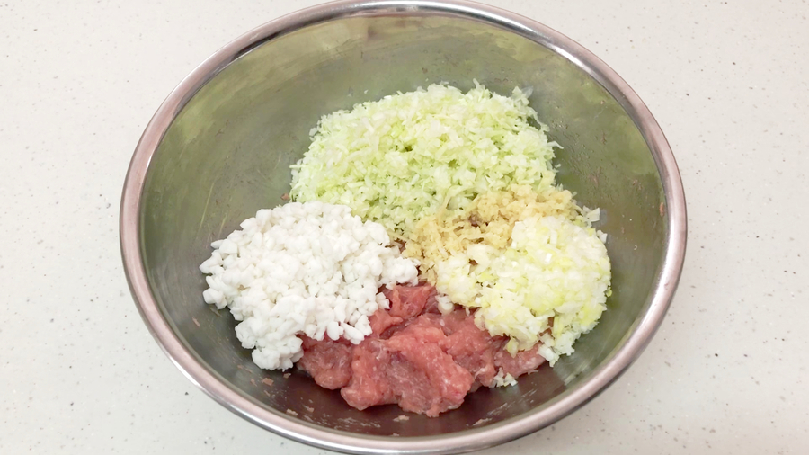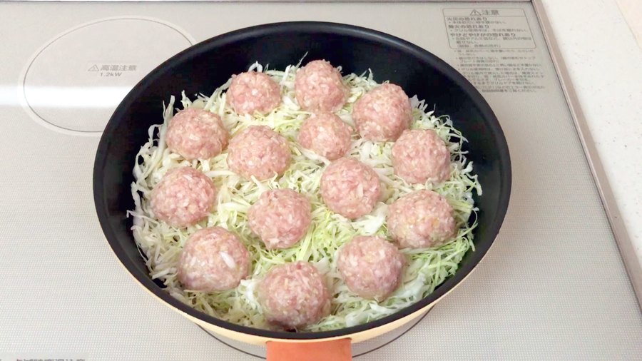 この上に肉などの具材を丸めたタネを並べ、切った焼売の皮をかぶせるようにのせます。