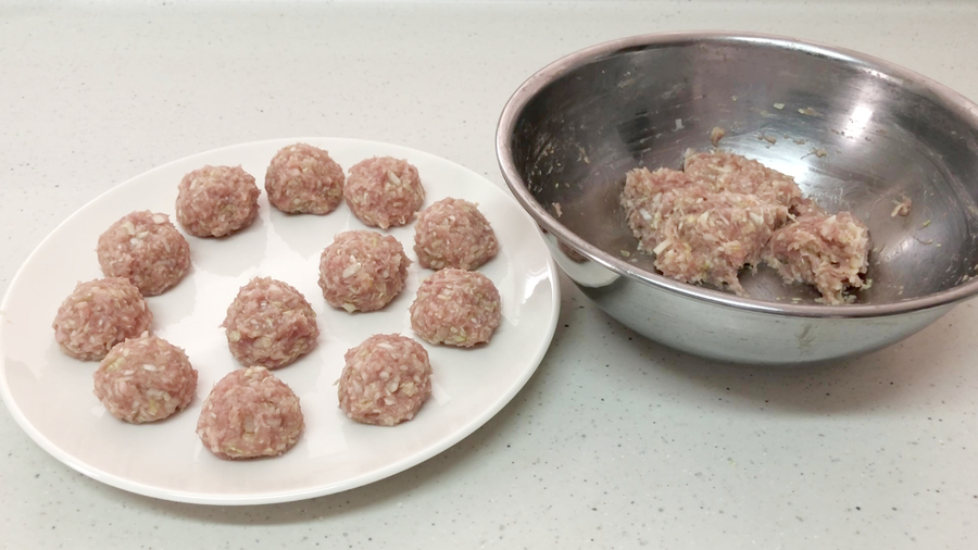 ボウルにキャベツⒶと白はんぺんと【D】(しょうがみじん切り大さじ1、ねぎみじん切り大さじ2)を加え均一に混ぜ込み片栗粉大さじ1を入れて、よく混ぜたら、16個に丸めます。