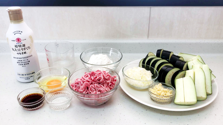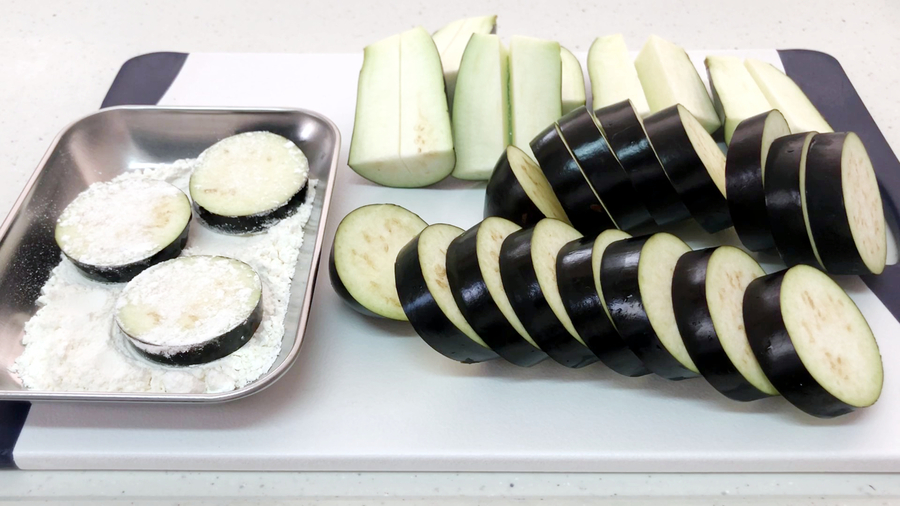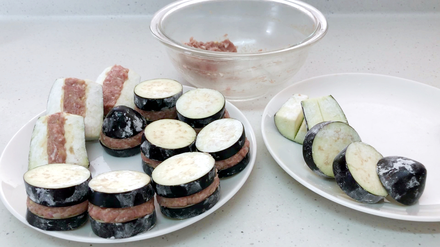 切ったナス2枚一組にして調理した豚ひき肉を挟み、もう一度、薄力粉を全体にうすくまぶします。