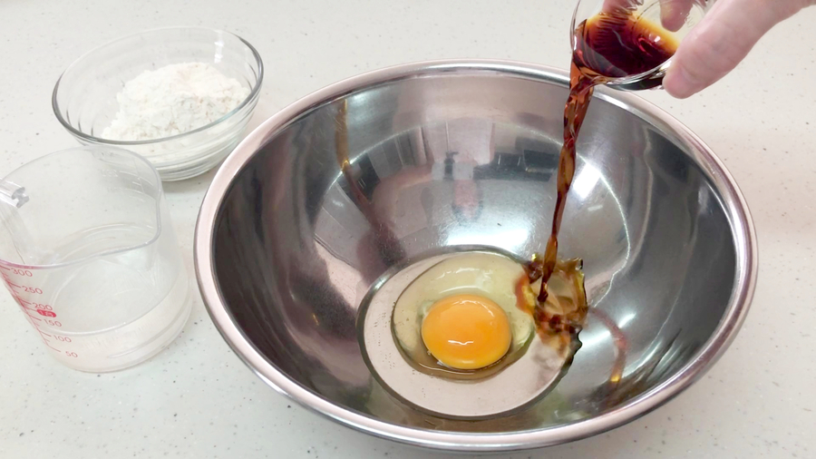 【イ】(薄力粉50g、片栗粉20g)は混ぜておき、ボウルに【ロ】(卵1個、淡口醤油大さじ1、冷たい水1/2カップ)を入れてよく混ぜ、ここに【イ】を入れ軽く混ぜて衣を作ります。