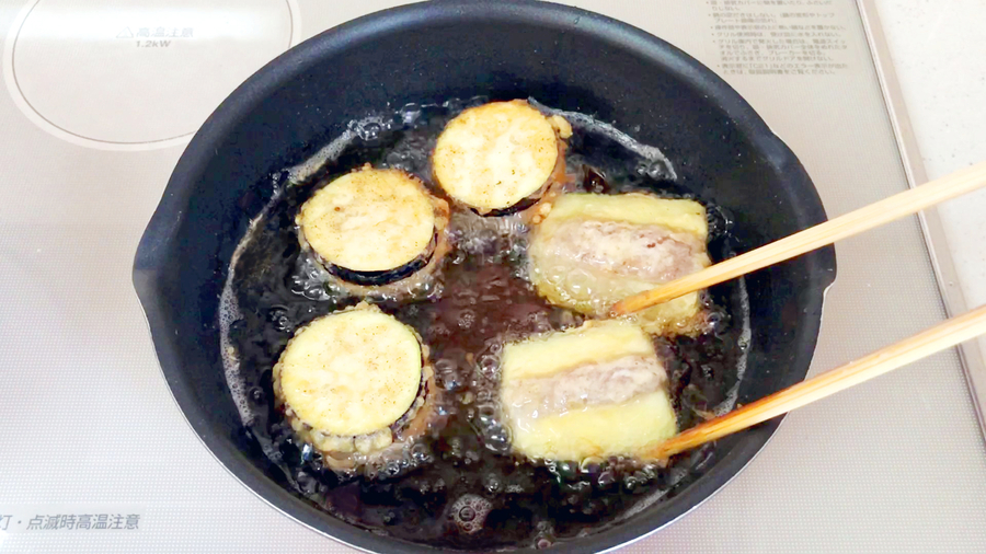 豚のひき肉を挟んだナスに衣をたっぷりつけて、170度の揚げ油で4~6分かけてカリッと揚げます。