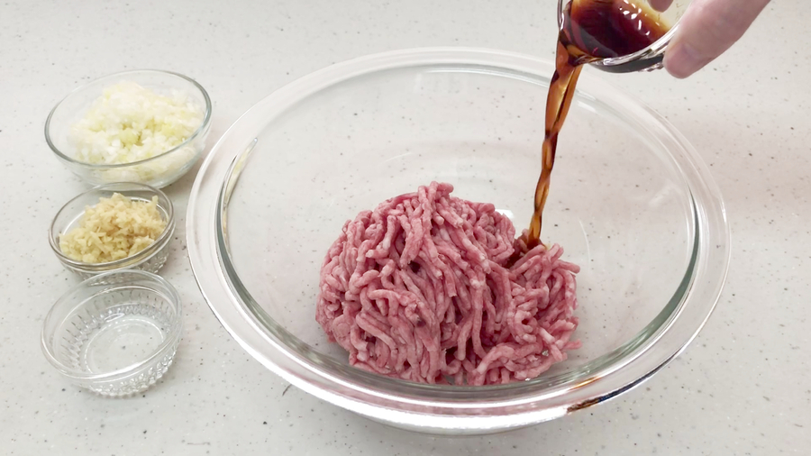 豚ひき肉150gに【A】(淡口醤油大さじ1、酒大さじ1/2)を入れしっかり混ぜ、【B】(ネギみじん切り大さじ2、生姜みじん切り大さじ1)を加えて、均一に混ぜます。
