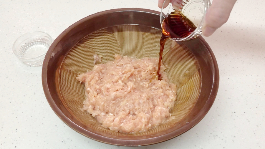 すり鉢に鶏むね肉のひき肉150g、鶏もも肉のひき肉150gと卵黄1個を入れてすりつぶし、【A】(淡口醤油大さじ1/2、酒大さじ1/2)を加えさらにすりつぶします。