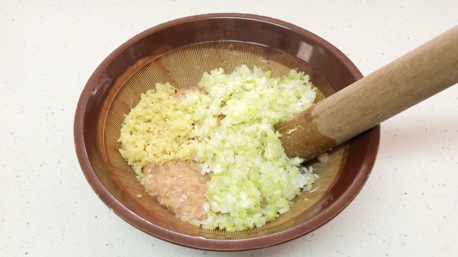 ここに【B】(ネギみじん切り大さじ5、生姜みじん切り大さじ1)を入れ、均一になるようにしっかり混ぜて12個に分けます。