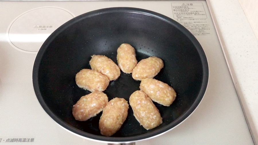 手に油をうすく塗りつくねのタネをのせてキャッチボールするように丸めて、てのひらで転がし、細長い小判型にしてフライパンに12個、置いていきます。