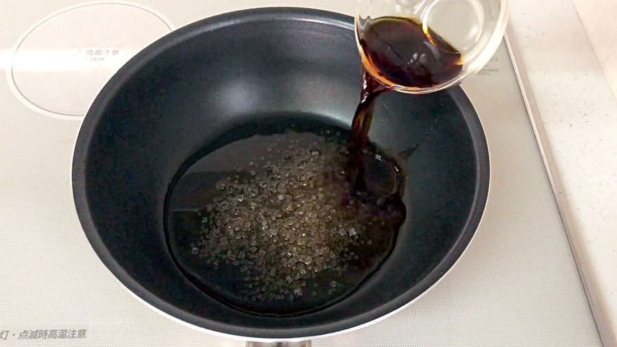 フライパンの汚れをふき取り、【C】(淡口醤油大さじ2、酒大さじ3、ザラメ大さじ1と1/2~)を入れ、とろりとするまで、煮詰め、【D】(淡口醤油小さじ1)で香りをつけ、タレができます。
