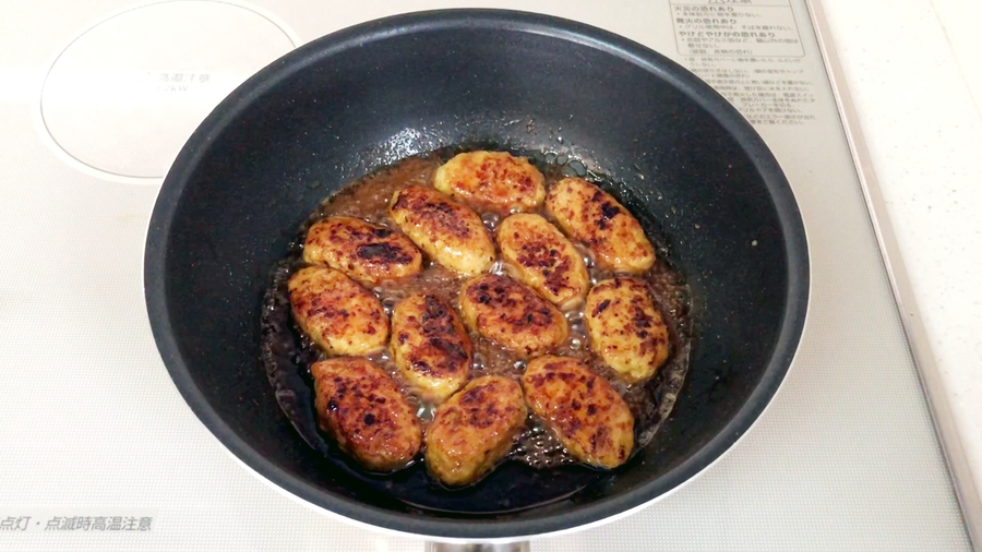タレに焼いたつくねのタネをもどし全体にタレを絡めます。