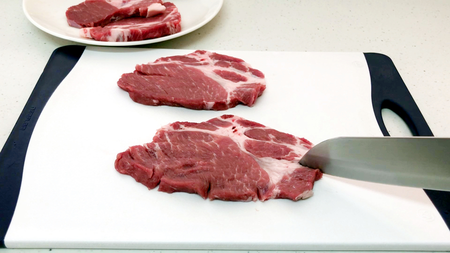 豚肩ロース肉320~400gの所々に切れ目を入れます。