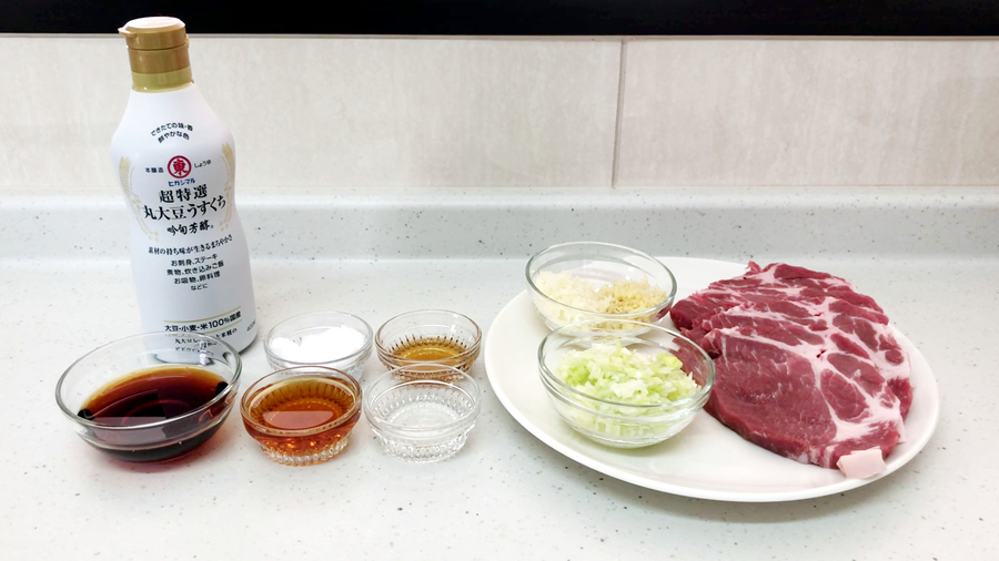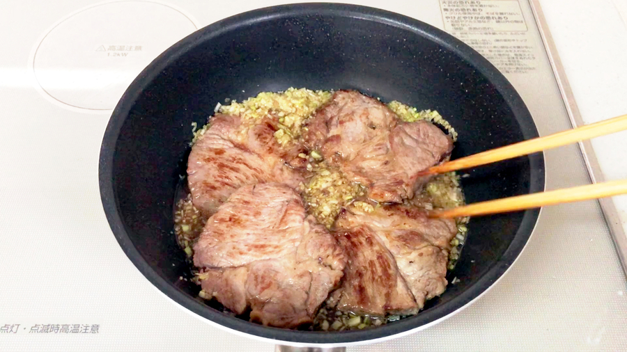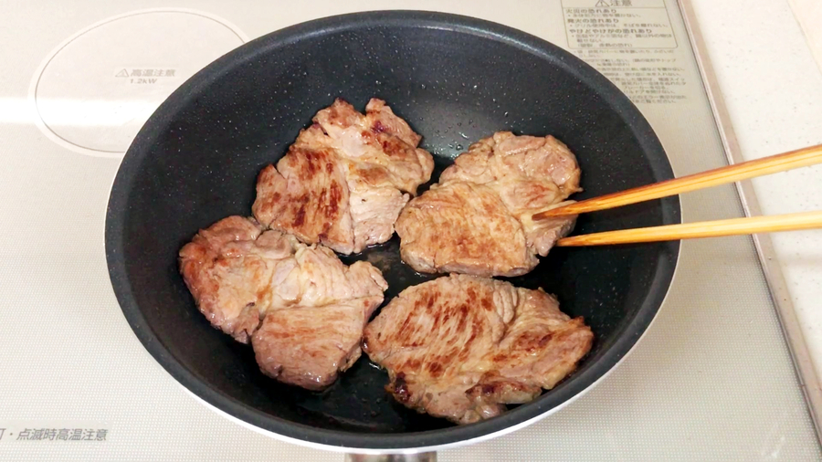 フライパンに油大さじ1/2を入れ、強火で熱し、豚肩ロースを入れ、肉の表面が膨らんで浮き上がり、焼き色がついたら、ひっくり返して、反対側にも同じように焼き色を付けて、8~9割程度火が通っている状態で取り出しておきます(余熱で火を通します)。
