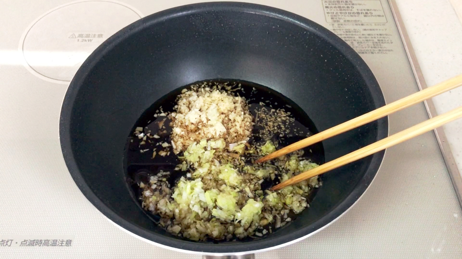 フライパンの油をふき、合わせておいた【A】(淡口醤油大さじ3、みりん大さじ2、酒大さじ1、砂糖大さじ1、ごま油小さじ1、ネギみじん切り大さじ3、ニンニクみじん切り大さじ1、生姜みじん切り大さじ1)を入れて火にかけて1分程度煮詰めます。