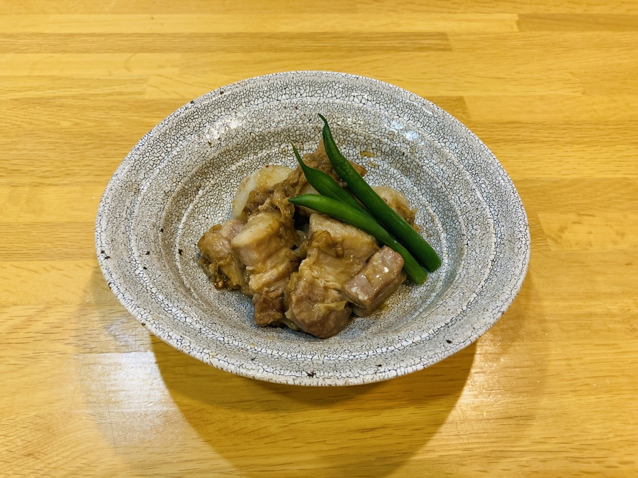 ②豚バラ肉200gは1センチの厚さに切り、火を止めた熱湯に3分つけ、
