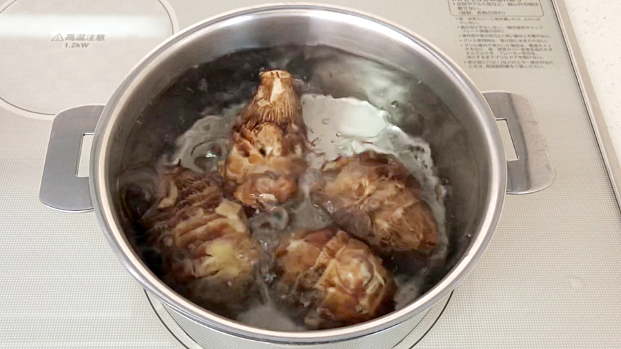里芋4~5個(300g)は汚れを洗い落とし、皮付きのまま、表面に浅めに切り込みを入れてから、熱湯に入れ、強火で6~7分ゆでて表面に火を通します。