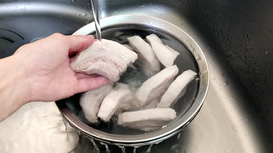 豚バラ肉200gは1センチの厚さに切り、火を止めた熱湯に3分つけ、その後ぬるま湯で洗い、水気をふき取ります。
