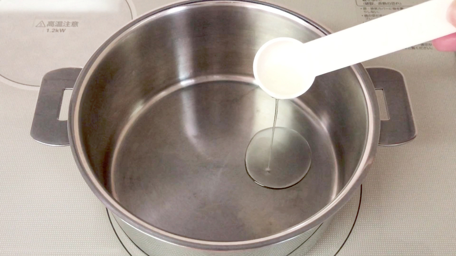 鍋に油大さじ1/2をいれ、弱火で2分かけて、なじませて、一度冷まします。