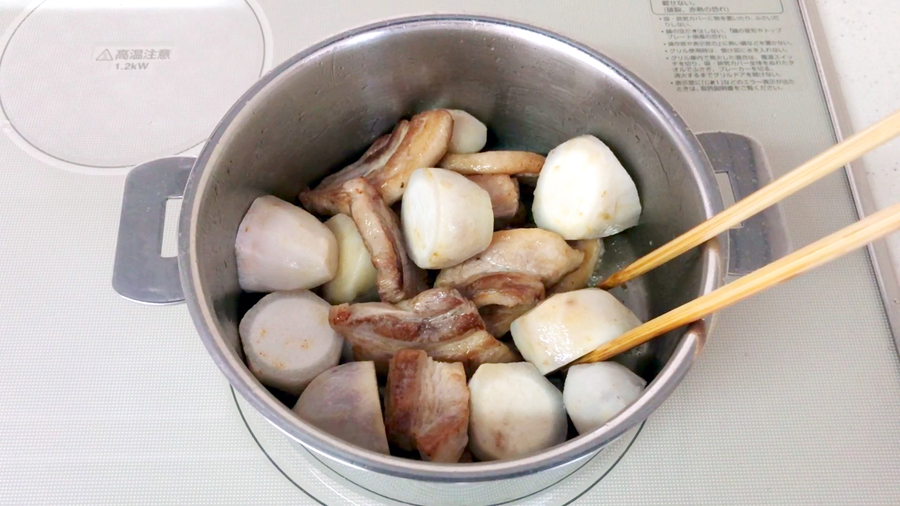 鍋を再度、火にかけ豚バラ肉をいれ、焼き色がつくまで炒めた後、里芋を入れて2分ほど炒めます。