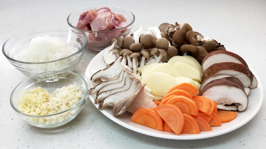 (以上のキノコ類は必ずしも4種類でなくてOKですが、合わせて200gあるとよいです)