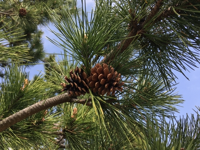 松の木には花粉を飛ばす雄花と種を作る雌花が別々にあり、春頃、緑色に茂っている松の木の枝の先に少しだけ丸みを帯びた赤いものが雌花で、その下に茶色のものが集まっているものが雄花です。