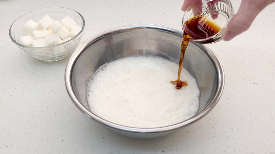 すべての具材を合わせたものにすりおろした長芋に淡口醤油を混ぜたものを全体に4つの皿に均等にかけます。