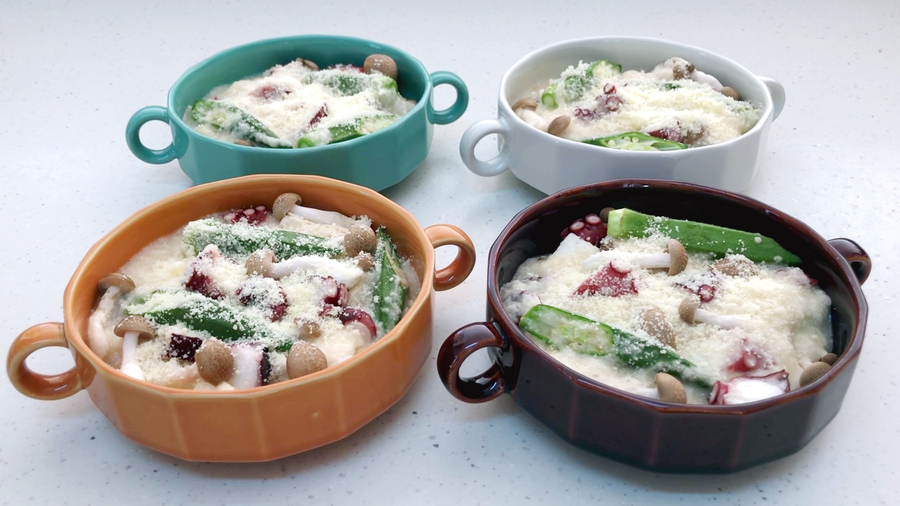 グラタン皿4つの内側にバター適宜をうすく塗り、長芋、白はんぺん、蒸しダコ、オクラ、シメジを均等に分け、【B】(淡口醤油をそれぞれの皿に大さじ1/2(合計大さじ2)に分ける)を具材に振りかけます。