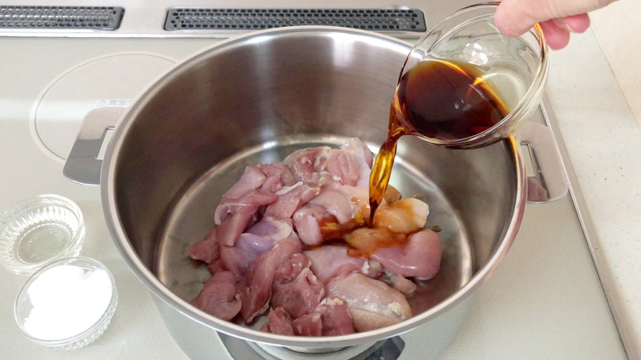 鶏もも肉200gは脂身を取り除き、1.5センチの角大に切り、【A】(淡口醤油大さじ3、砂糖大さじ2、酒大さじ2)といっしょに21センチほどの鍋に入れて、火が通るまで3,4分煮てしばらく置きます。