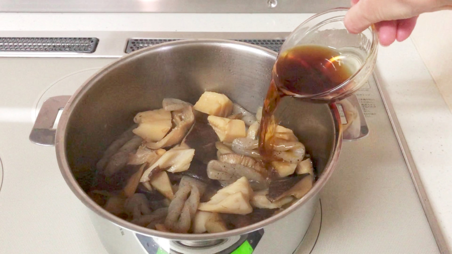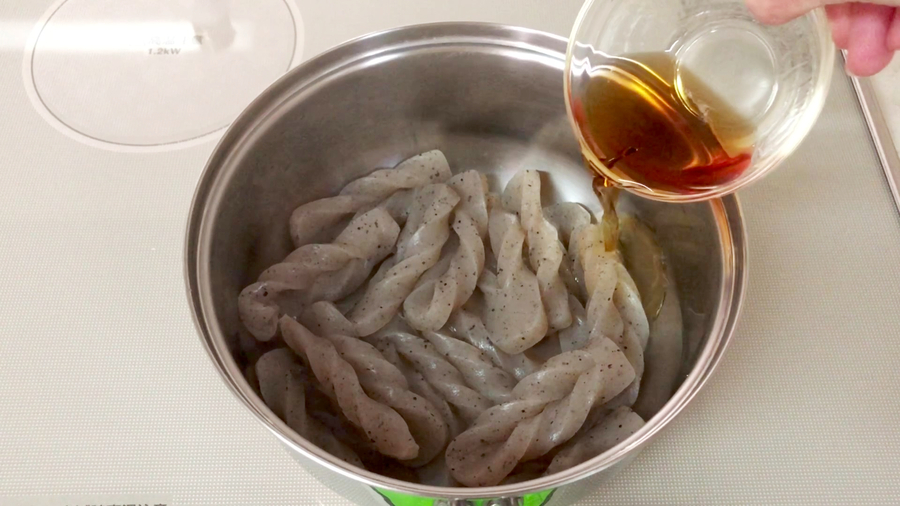 そこに【B】(淡口醤油大さじ1/2、酒大さじ1)を加えてこんにゃくに下味をつけます。