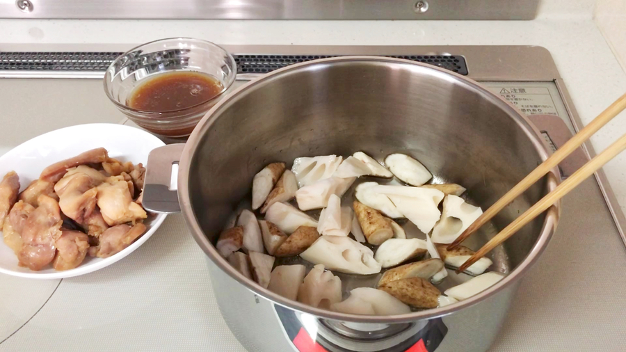 煮汁のうまみがついている鍋に油大さじ2を入れ火にかけて、ごぼうとレンコンを3,4分中火でしっかり炒め、次にシイタケ30秒、タケノコ30秒、こんにゃく30秒と順に炒めていきます。