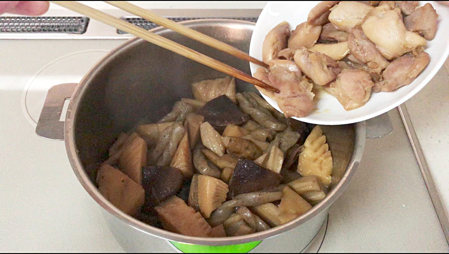 鍋からとり出していた鶏もも肉を入れ、鍋返しをしながら、ひと煮立ちさせ、完成です。