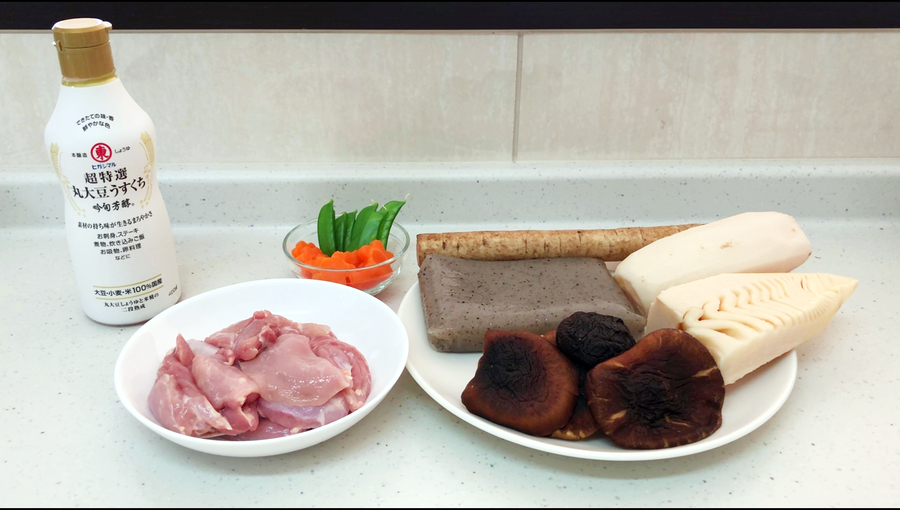 煮汁(内訳:鶏肉を煮た時に煮汁+シイタケの戻し汁1/2カップ+水) 400cc