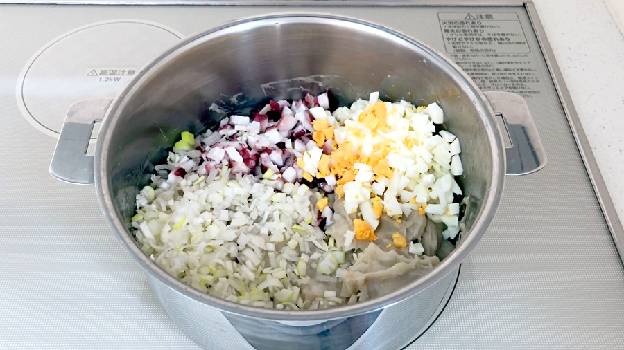 タコ100g、ゆで卵2個は粗みじんに切ります。