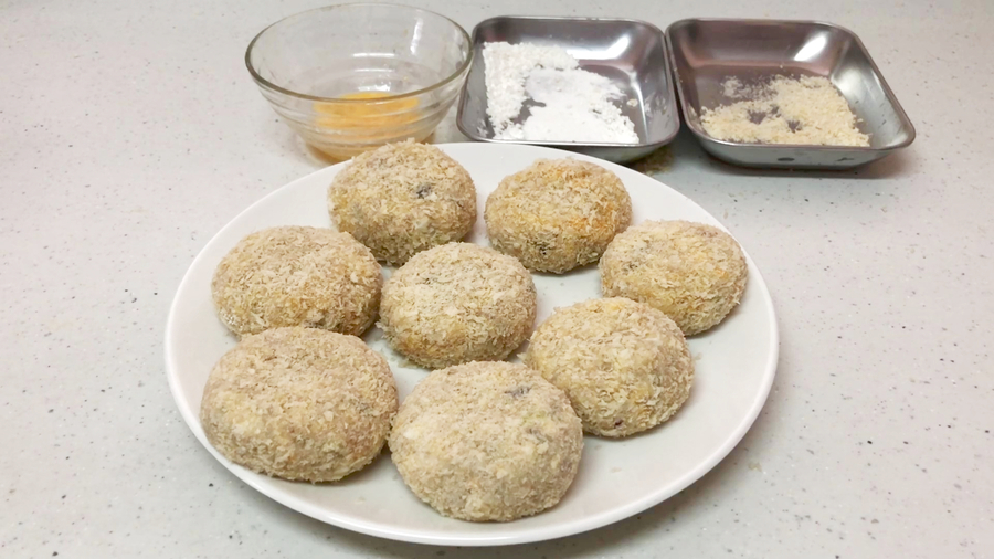 タネは球形のまま、薄力粉をまぶして、卵と淡口醤油を合わせたものにくぐらせ、パン粉をまぶしたあとに、8センチくらいの小判型にします。