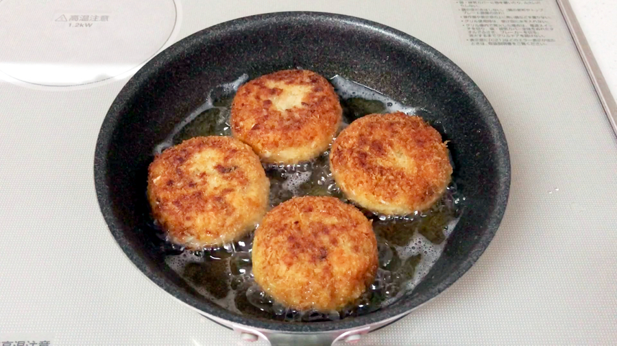 お玉一杯くらいの油をフライパンに入れて、中温で熱し、油をかけながら、3,4分こんがりきつね色に揚げ焼きしたら完成です。