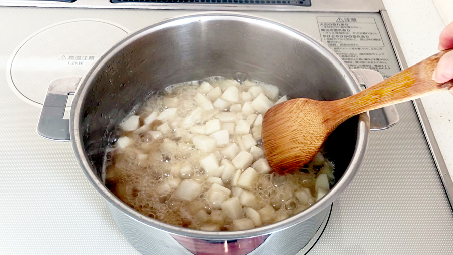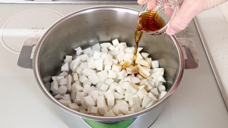 里芋400gは皮をむいて、1センチ角のさいの目に切って、【A】(水1カップ,淡口醤油大さじ1,ヒガシマルうどんスープ1袋)と一緒に鍋に入れます。