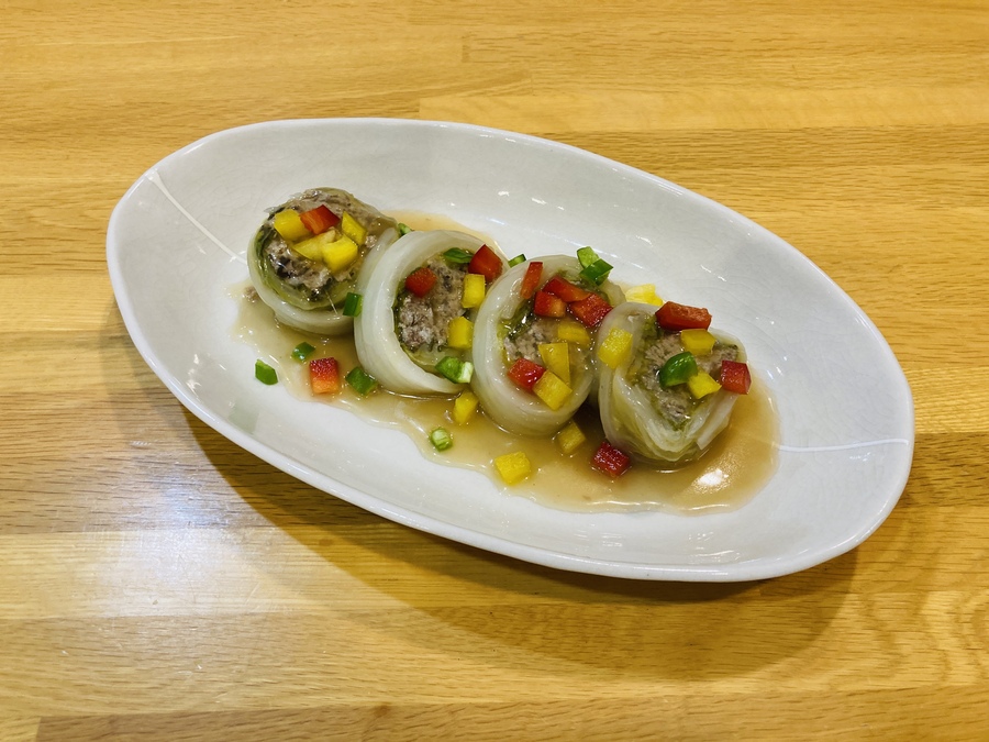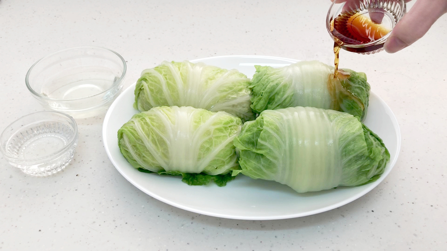 タネを包んだロール白菜を耐熱皿に乗せて、【B】(白菜の蒸し汁大さじ3、淡口醤油大さじ1、酒大さじ2)を全体に振りかけてラップをかけて600wの電子レンジで20分かけて、ロール白菜を器に盛ります。