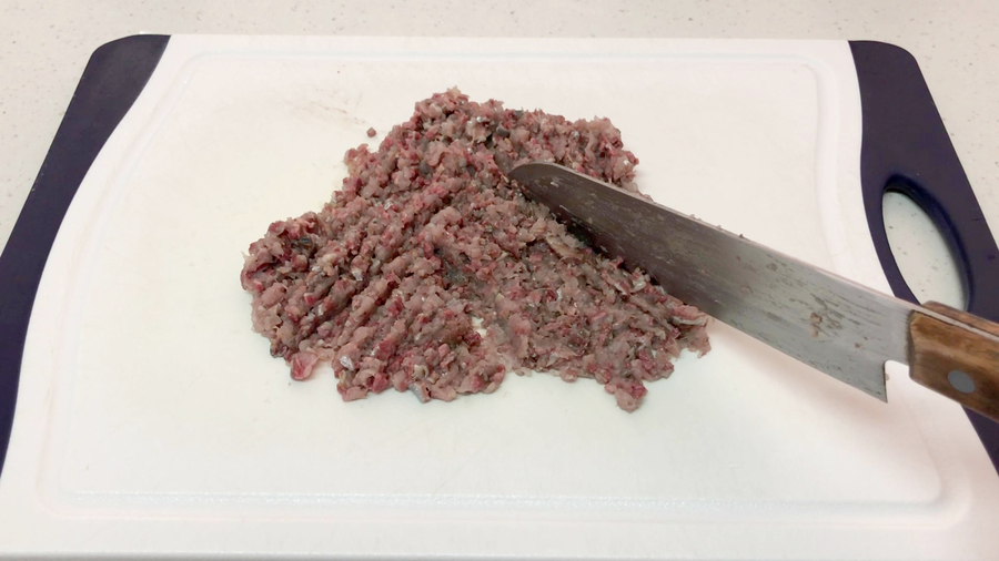 これを細かく切り、粘りが出るまで包丁でたたき切ります。