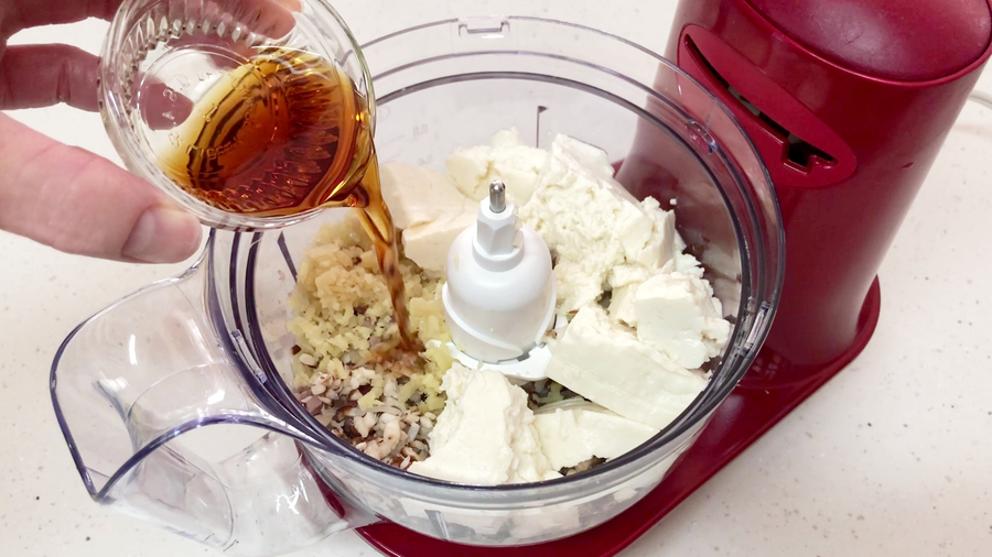 切ったイワシと【A】(生姜のみじん切り大さじ2、ネギのみじん切り大さじ2、生シイタケかさ1枚のみじん切り)をボウルに入れて、キッチンペーパーで水気をとった木綿豆腐1/4丁と淡口醤油大さじ1と片栗粉大さじ1を入れて、撹拌機でよく混ぜます。