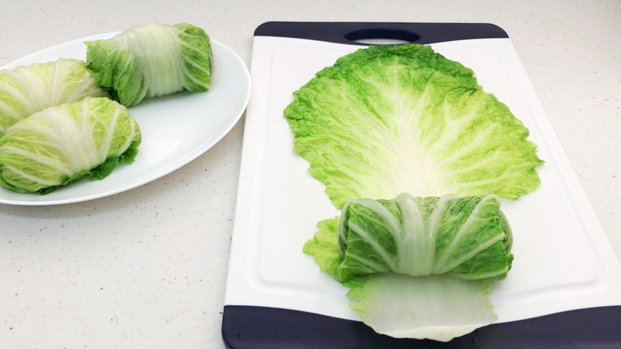 葉先だけの白菜にイワシや豆腐のタネををのせて、さらにそれを切っていない白菜で包みます。