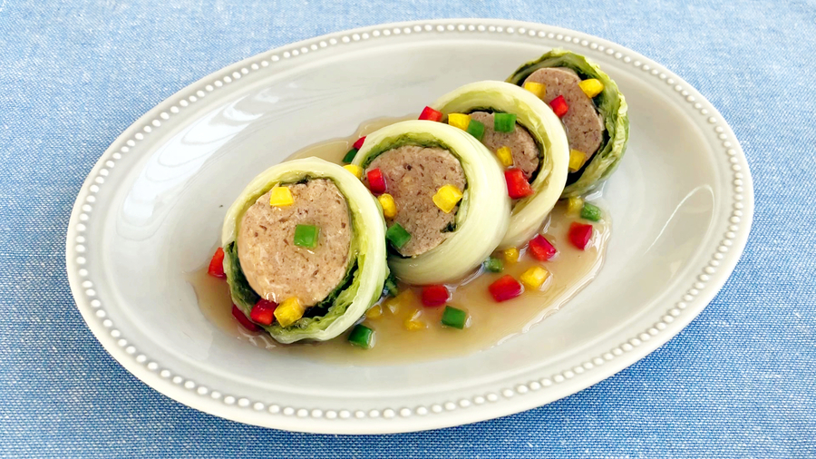 【C】(淡口醤油大さじ1/2~)で味を調えて、【D】(片栗粉小さじ1、水小さじ2)の水溶き片栗粉でとろみをつけて、器に盛ったロール白菜にかけて完成です。