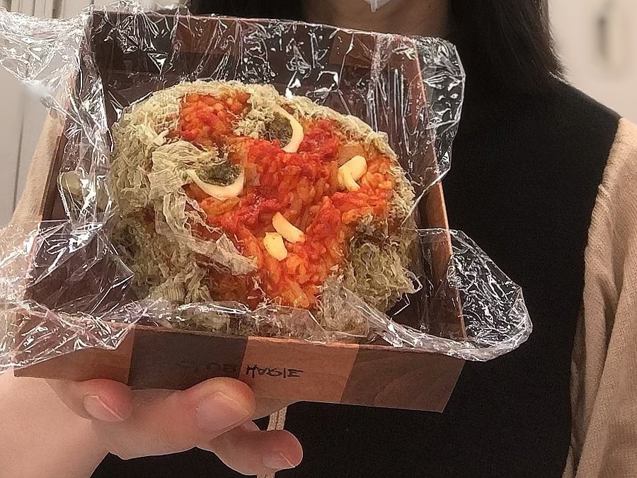 ついに、加藤が理想の色を追い求めたおにぎりアート「赤鬼ぎり」の完成です。