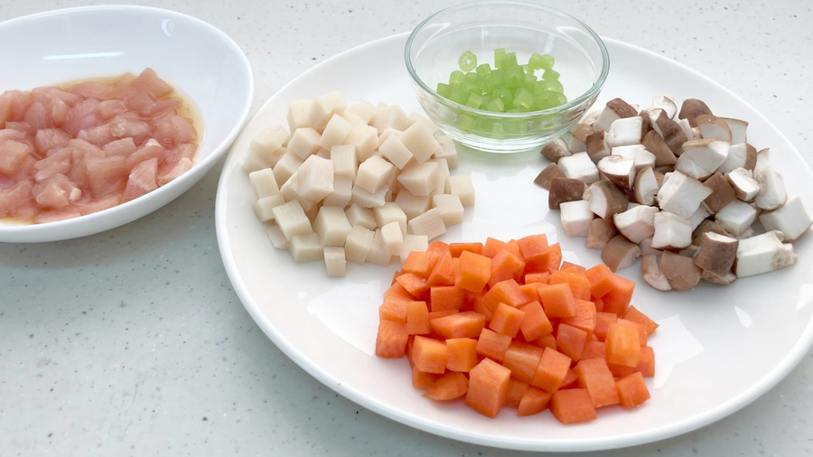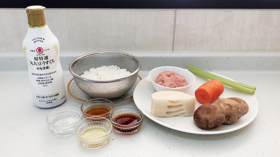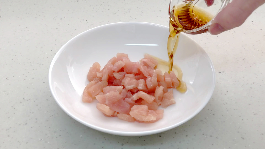 鶏肉50gは1センチ角大に切り、【A】(淡口醤油小さじ1、酒小さじ1)で下味をつけておきます。