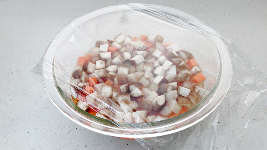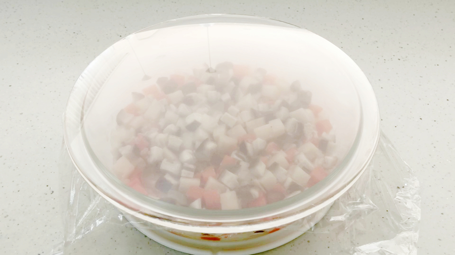 ラップを隙間なく、張り替えて10分蒸らします。